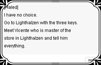 34. Халед разочарован в нашей находке и очень нехотя отправляет нас к последнему главе Комнаты теней Висенту который заведует магазином в Лайтхазене.