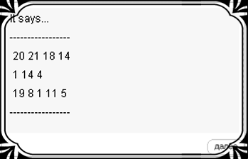 4. Страшный Человек предлагает нам принять участие в разгадке закодированного сообщения. Объяснив как работает кодировка, он выдает нам собственное закодированное сообщение и говорит о необходимости сходить туда - куда скажет это сообщение.